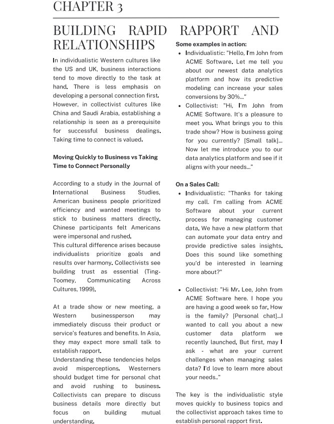 - Build professional trust and credibility - the cornerstone of sales success in individualistic societies